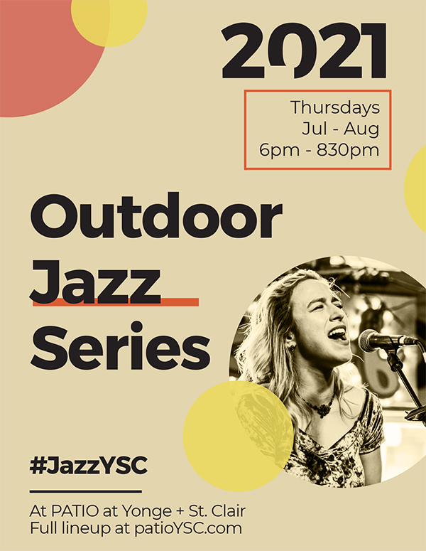 The Outdoor Jazz Series returns July – August 2021 and will be hosted at PATIO at Yonge + St. Clair. The Yonge + St. Clair BIA welcomes you to enjoy a series of live jazz performances free of charge every Thursday evening from 6PM – 830PM, on the outdoor patio located at 1503 Yonge St.