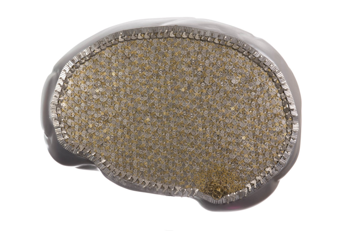 Q: Gear Head is encrusted with thousands of vintage watch parts, appearing to be one cohesive movement. How did you source the parts for the sculpture and how long did this sculpture take to create?