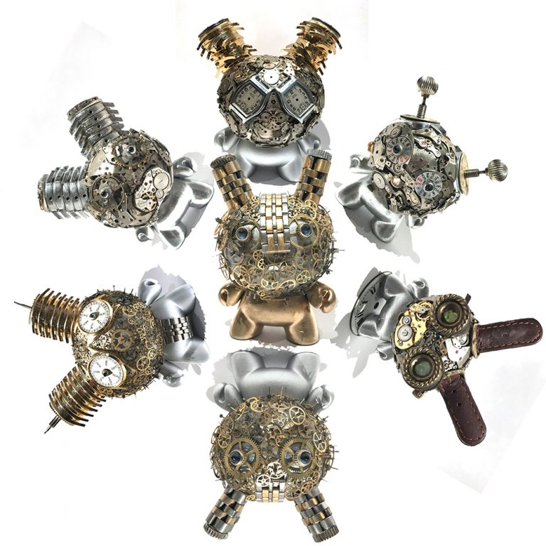 My artwork is constantly evolving. While I continue to use the same medium I work hard to reach different audiences. One project I just completed was working with Kidrobot on one of their vinyl figures called the Dunny. I encrusted them with vintage watch parts turning these typically soft and light figures into a heavy steampunk character.