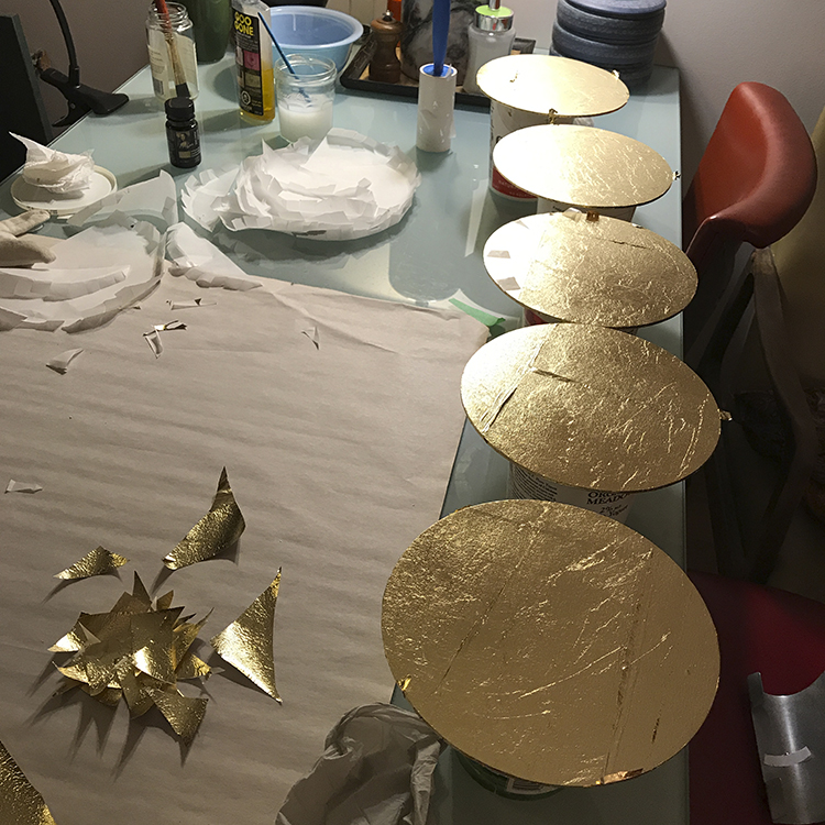 To add another vintage element to my work I used metal leaf as a background.  I applied the metal leaf to 7-inch wooden circles or rounds.  The gold, silver and copper metallic backgrounds shimmer and change according to the light conditions and resemble early photographic processes such as daguerreotypes and tintypes.  And then I finished up the pieces by printing my photographs onto transparent film which allows the metal leaf to shine through the image.
