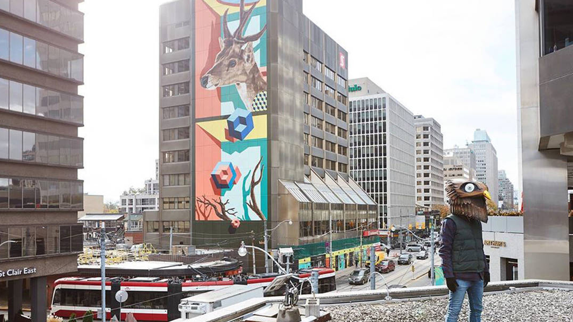 To explore more art in the Yonge + St. Clair neighbourhood, visit the free, local public art including the Deer Park mural piece by birdO at 1 St. Clair E, the phlegm mural at 1 St. Clair W, and the #WaterfallYSC installation by Studio F-Minus at 1406 Yonge St.