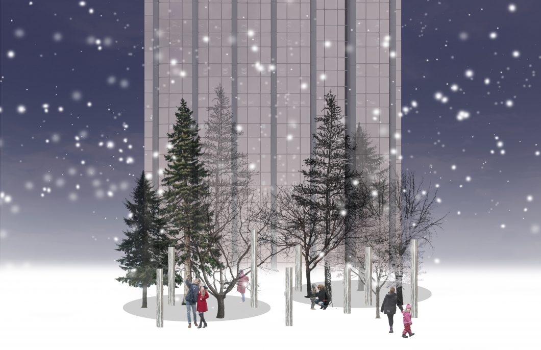 Starting an installation, much like starting larger projects, begins with an understanding of the site it is to occupy. We were first inspired by the trees of Delisle Parkette and how delightful it is to amble through this urban forest. We set out to increase its density and extents by introducing reflective “tree-trunks”, adding an element of whimsy and playfulness to the parkette.