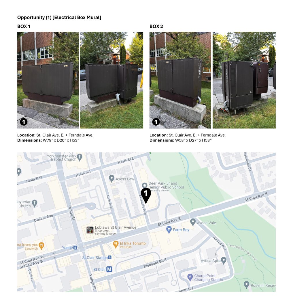 Please note these are separate proposals. Submit each proposal as a single PDF electronically to jason@yongestclair.staging.blackjetdigital.ca with the following subject line: For the opportunity (1) title: “RFP – Street Mural Projects 2024 – Electrical Boxes [Your Name]”. For the opportunity (2) title: “RFP – Street Mural Projects 2024 – Brick Wall [Your Name]”. Please also direct any questions to jason@yongestclair.staging.blackjetdigital.ca.