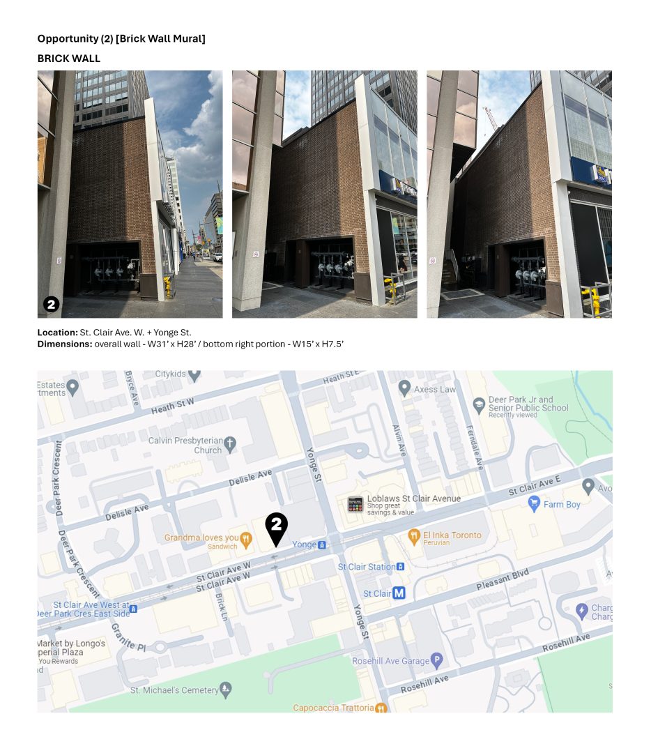 - One (1) partially protruding brick wall located along iconic St. Clair Ave. near Yonge St.